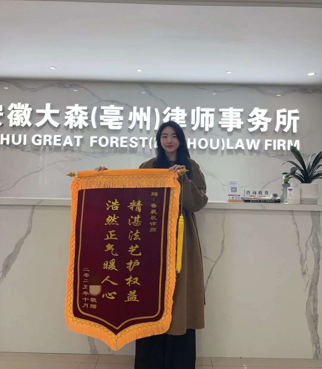 10月25日,大森(亳州)律师事务所的鲁晨晨律师收到了当事人赠送的锦旗。