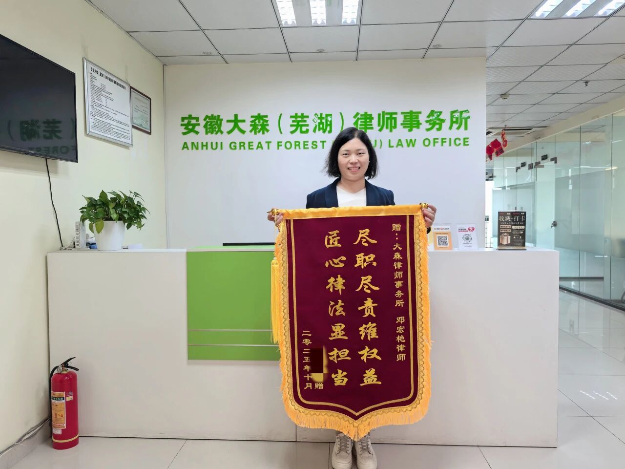 10月29日,大森(芜湖)律师事务所主任邓宏艳律师收到了当事人赠送的一面锦旗。