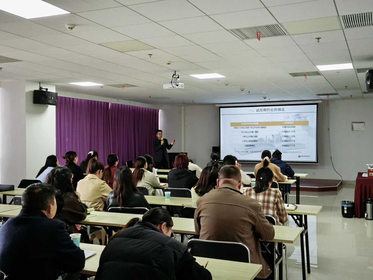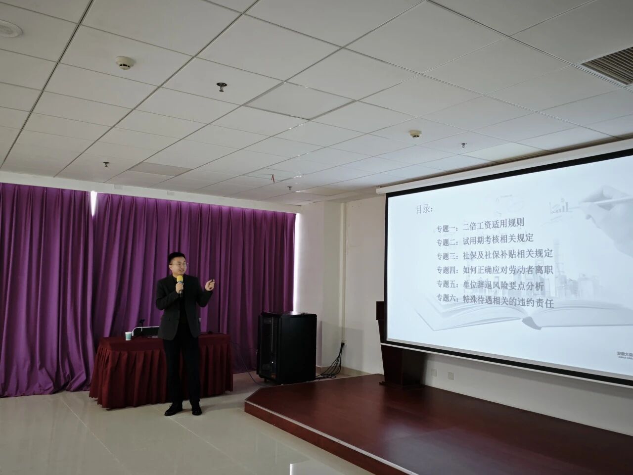 2025年10月31日,由六安裕科创新孵化器有限公司主办,大森(六安)律师事务所、六安高新裕创人力资源有限公司联合承办的“劳动争议常见问题分析”在高新区双创大厦圆满举行。胡来律师作为主讲嘉宾,为现场的企业职工、人事管理人员及企业高管带来了一场普法讲座。